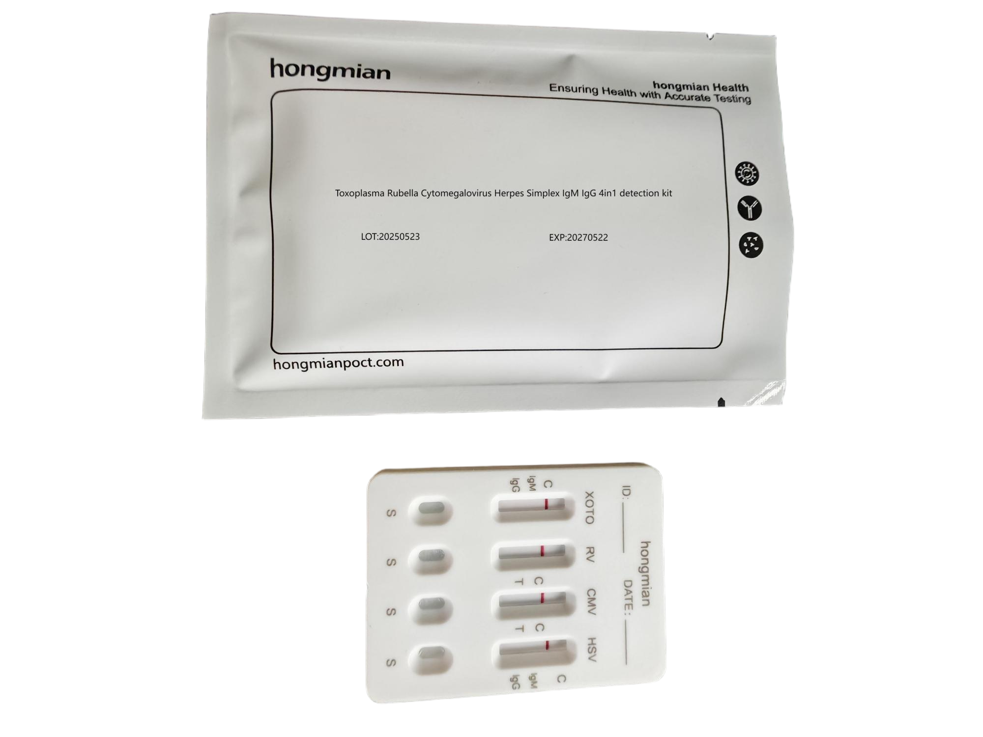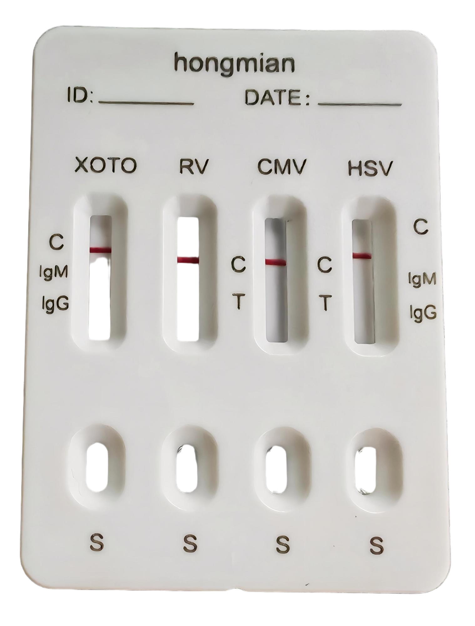 Hongmian wholesale 4-in-1 toxo RV CMV HSV rapid test kit quickly distinguishes between IgM and IgG, making it a highly efficient tool for prenatal and postnatal screening in obstetrics and gynecology departments, reproductive centers, and clinical laboratories. Wholesale and customization are available; inquiries are welcome!